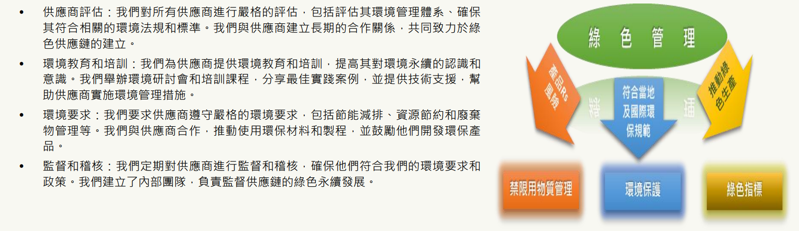 廠區於選商時即針對品質、價格、環保認證、污染事件、勞工爭議事件、不使用非法童工、貪腐/賄賂事件與誠信經營等各方面設定評分指標、嚴格審查,符合資格的供應商才能提供樣品測試。