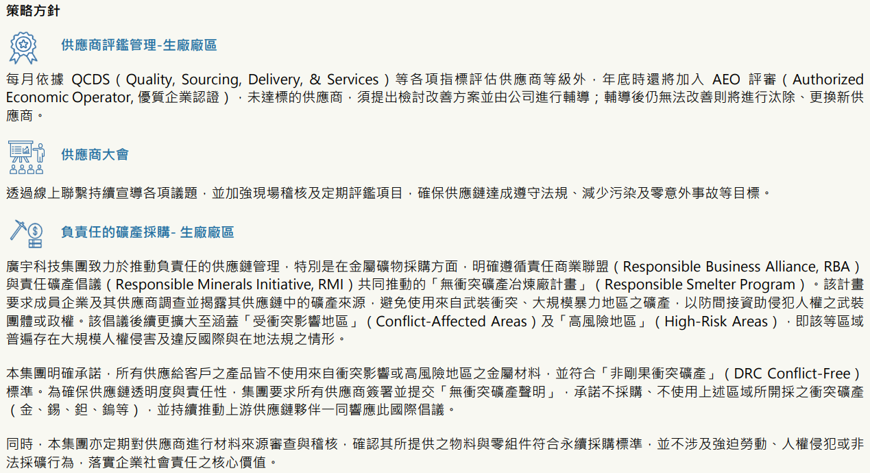本公司絕不採購及使用來自受衝突影響之地區如剛果民主共和國及其周圍國家和地區內所開採的『衝突礦產』,以及不採購及使用高風險地區,是指有可能存在政局不穩或政治壓迫、制度缺陷、不安全因素、民用基礎設施崩潰、以及廣泛暴力活動的地區,所開採的礦產,要求供應商亦須遵守此聲明及管理原則。