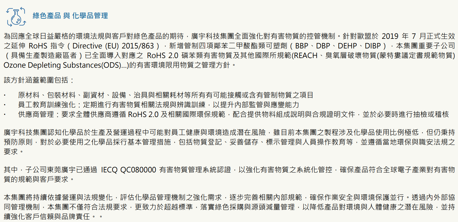 環保法規:針對歐盟於2019 年7 月生效的新增四項可塑劑危害物質 (BBP/ DBP/ DEHP/ DIBP) 之延伸RoHS 指令(EU)/2015/863 RoHs 2.0 之有害物質管理,本集團之重要子公司(具生產廠區)也已經制定RoHS 磷苯(含RoHs 2.0)、及其他有害物質的管理方針,全面監管可能包含有害物質的原材料、包裝材料、副資材、設備、治工具及相關耗材等,增加員工的相關訓練以強化對有害物質的監管能力,也要求所有供應商全力配合,以達到法規規範及客戶標準。