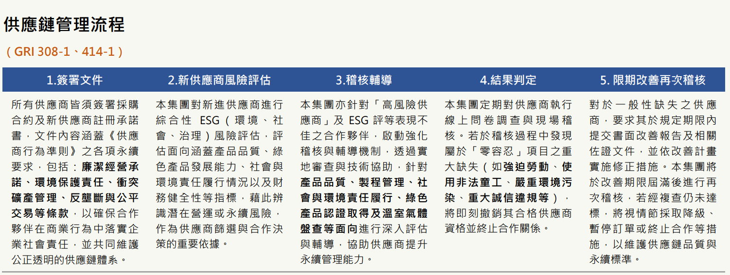 本公司將實踐企業社會責任之決心與使命,拓展與業務密切合作的供應商夥伴。我們逐步於供應商合約中納入企業社會責任條款,並以 100%要求供應商履行ESG 條款作為長期目標。若供應商違反條款規範,我們將要求限期改善,重大違規者可能終止與解除合作。並持續與供應商溝通及傳遞社會責任相關訊息,鼓勵供應商開發減少環境衝擊的材料,或從製程或設備進行節能減碳,共創雙贏的夥伴關係。