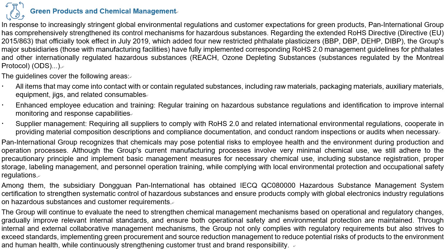Furthermore, Pan-International conducts regular annual supplier conventions to reinforce awareness of business integrity, legal compliance, anti-corruption measures, and the responsible sourcing of minerals, avoiding conflict or high-risk materials.