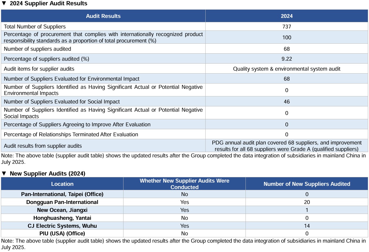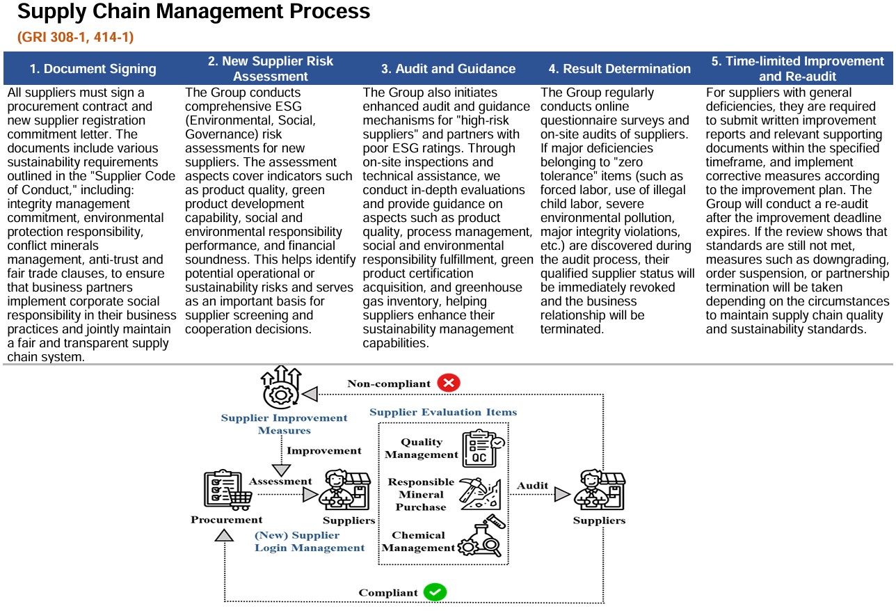 The Group has established a sustainable supply chain management mechanism focusing on three major aspects: product quality, legal compliance, and social responsibility. We have formulated requirements and evaluation standards for operating conditions, manufacturing and supply capabilities, technology development capabilities, quality assurance capabilities, management system performance, environmental management capabilities and trade security. New suppliers must pass an evaluation to be registered on the "Qualified Supplier List." Additionally, suppliers are randomly inspected each year to ensure they continue to meet our evaluation standards. Only those confirmed to pass the evaluation eligible for continued cooperation. We aim to improve supply chain management through pre-assessment, supplier commitments, and regular audits. In addition, considering ESG trends, besides corporate governance and environmental sustainability, employee rights are also a crucial aspect. We will reference international standards such as the "United Nations Guiding Principles on Business and Human Rights," the International Labour Organization's "Declaration on Fundamental Principles and Rights at Work," and the "Universal Declaration of Human Rights," as well as local labor laws in various regions. We will gradually require all suppliers to ensure their business practices in areas such as labor rights, health and safety, and employee benefits comply with the Group's guidelines and commitment letters, and fully comply with the legal regulations in their operating regions.