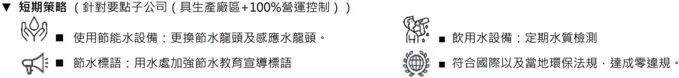 本集團重視水資源治理,將其納入永續發展策略,並以 ESG 指標作為推動依據,對應聯合國永續發展目標「SDG 6 淨水與衛生」。透過永續委員會監督管理、各廠區建置節水設備、推動水資源回收再利用及完善緊急應變機制,落實水資源的有效使用與保護。此外,所有子公司皆符合法規標準,2024 年度無重大缺水或排放異常事件,展現本集團落實水資源永續管理的承諾。
